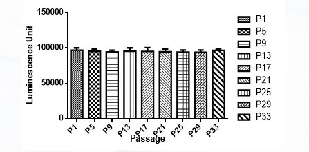 4. 示蹤細胞體外發(fā)光測試,測定發(fā)光信號強度和細胞傳代信號穩(wěn)定性,確保示蹤細胞在體外和體內都能穩(wěn)定高水平表達標記蛋白,以科佰生物A549-Luc細胞為例: