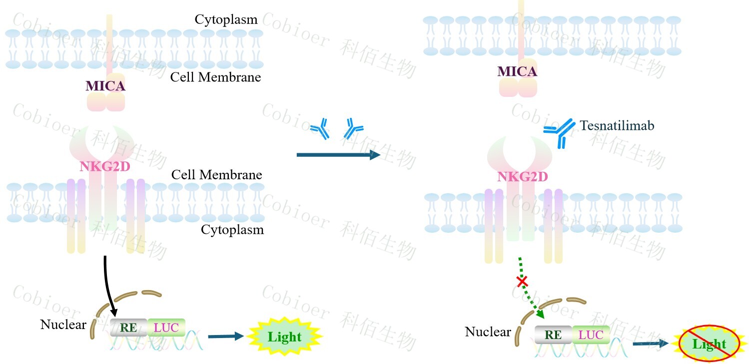 MICA CHO 作為 NKG2D Effector Reporter Cell 的靶細(xì)胞,很好的模擬了體內(nèi) NKG2D 的信號(hào)轉(zhuǎn)導(dǎo)過(guò)程,原理見(jiàn)下圖所示。