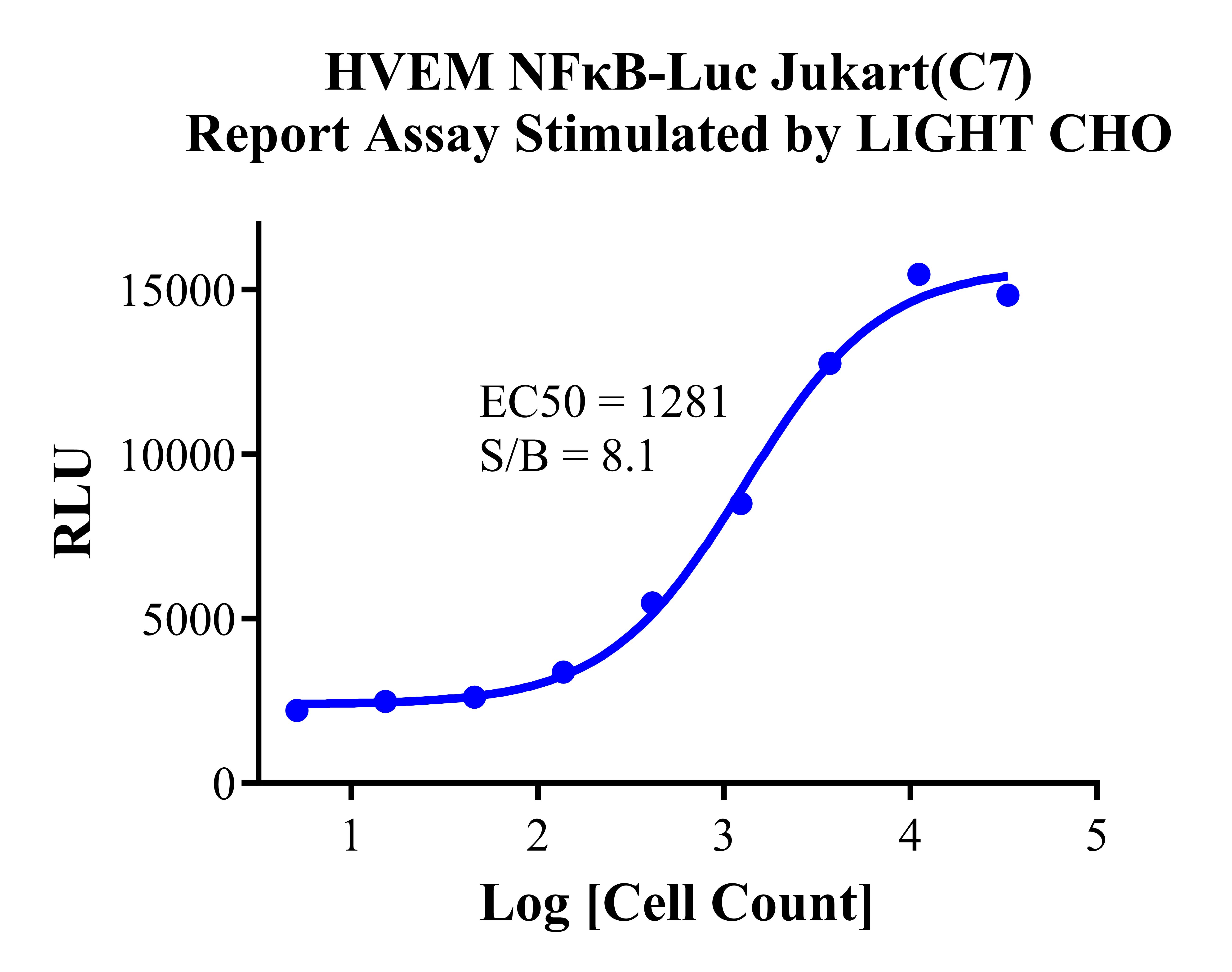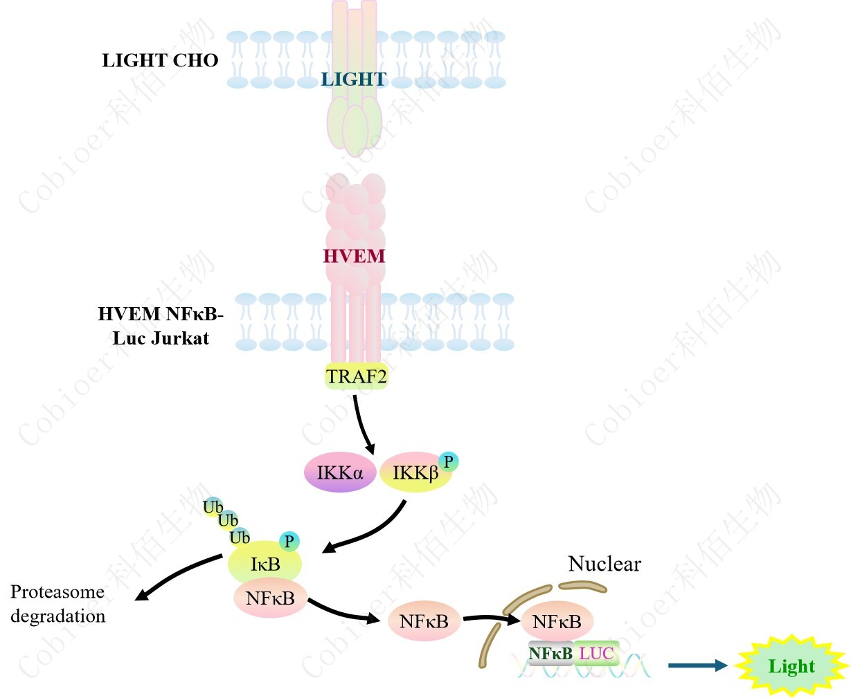 HVEM NFκB-Luc Jurkat 報告基因藥靶模型很好的模擬了體內(nèi) HVEM 的信號轉(zhuǎn)導(dǎo)過程, 原理見下圖所示。![]() Figure 1. HVEM NFκB-Luc Jurkat 細胞模型原理圖 |