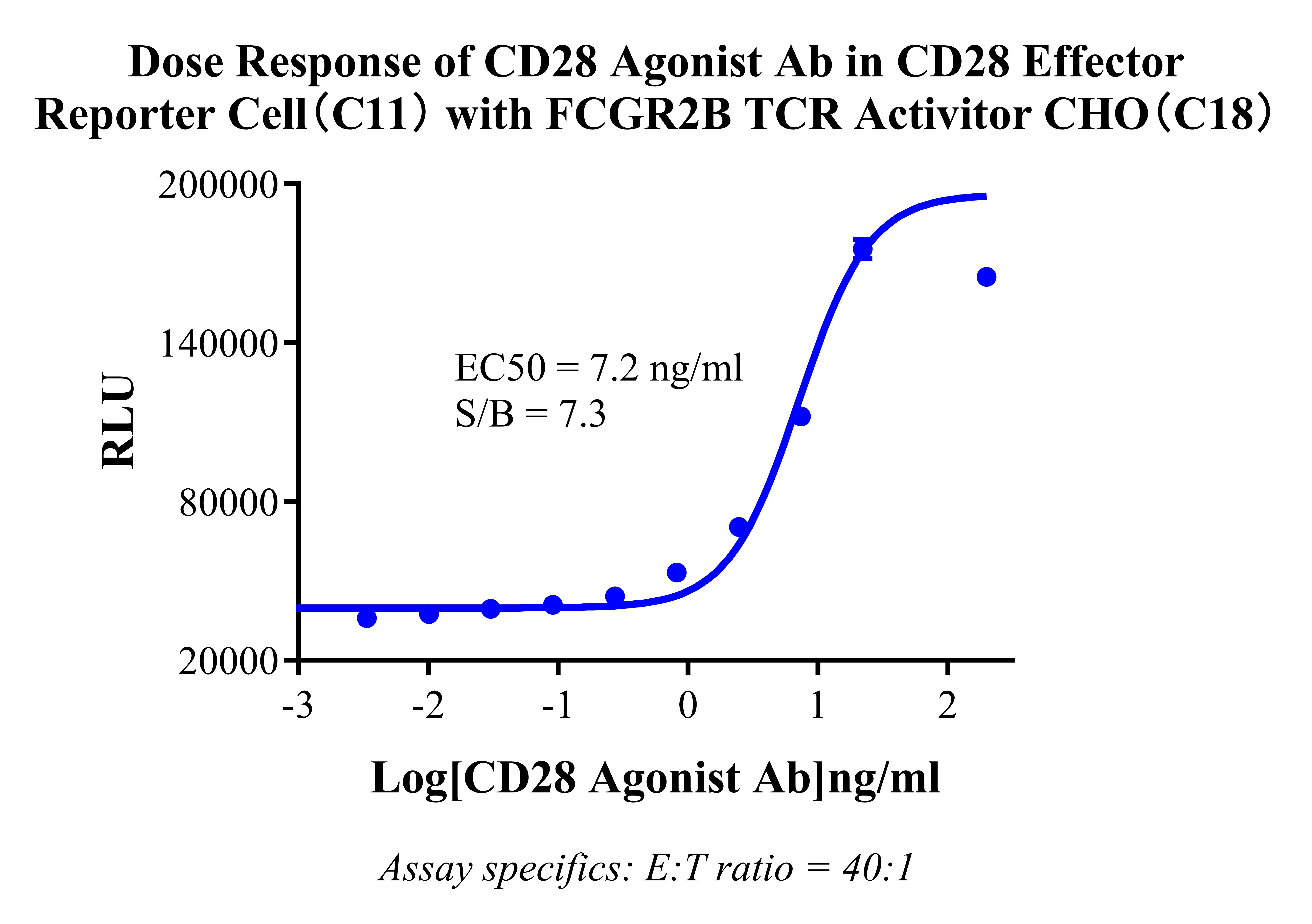 Figure 3 Dose Response of CD28 Agonist Ab in CD28 Effector Reporter Cell(C11) with FCGR2B TCR Activitor CHO(C18).