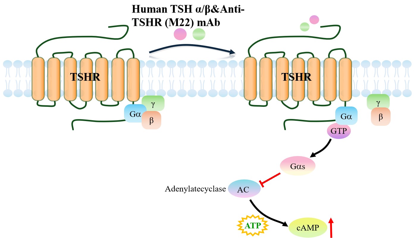 cAMP 在 G 蛋白偶聯(lián)受體(GPCR)信號(hào)轉(zhuǎn)導(dǎo)中是一種關(guān)鍵的第二信使。當(dāng)配體結(jié)合 到 GPCR,構(gòu)象發(fā)生變化,激活受體接著激活 G 蛋白,Gs 的激活導(dǎo)致腺苷酸環(huán)化酶調(diào)控 cAMP 的升高。TSHR 藥靶模型很好的模擬了體內(nèi) TSHR 的信號(hào)轉(zhuǎn)導(dǎo)過(guò)程,原理見(jiàn)下圖所示。