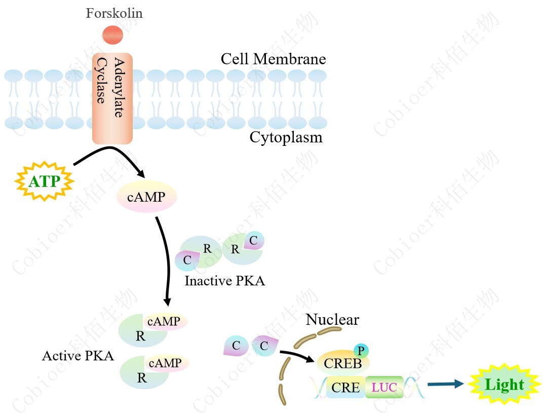 CRE-Luc CHO 報告基因細(xì)胞,是由 CRE 調(diào)控并表達(dá) Luc 熒光素酶報告 基因的 CHO 細(xì)胞。Forskolin 是天然存在的直接腺苷酸環(huán)化酶(AC)/cAMP/CREB 的激活 劑,原理見下圖所示。