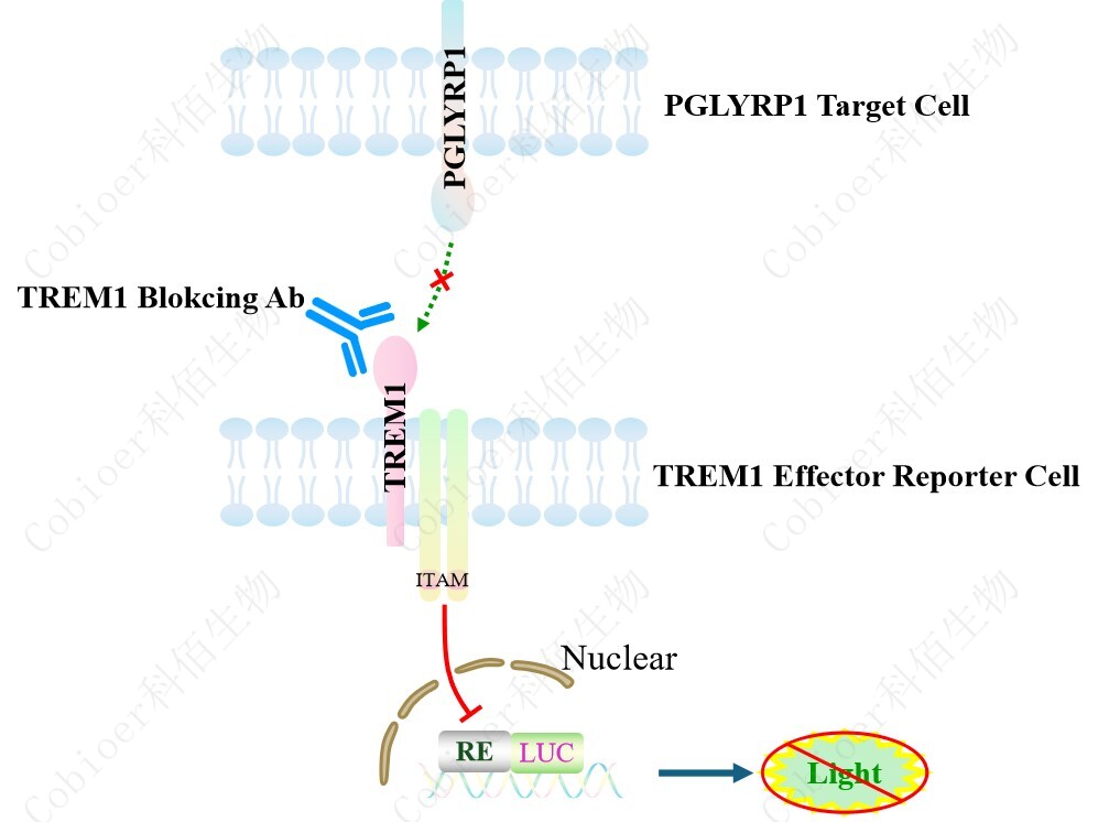 PGLYRP1 Target Cell 作為 TREM1 Effector Reporter Cell 的靶細(xì)胞,很好的模擬了體內(nèi) TREM1 的信號轉(zhuǎn)導(dǎo)過程,原理見下圖所示。