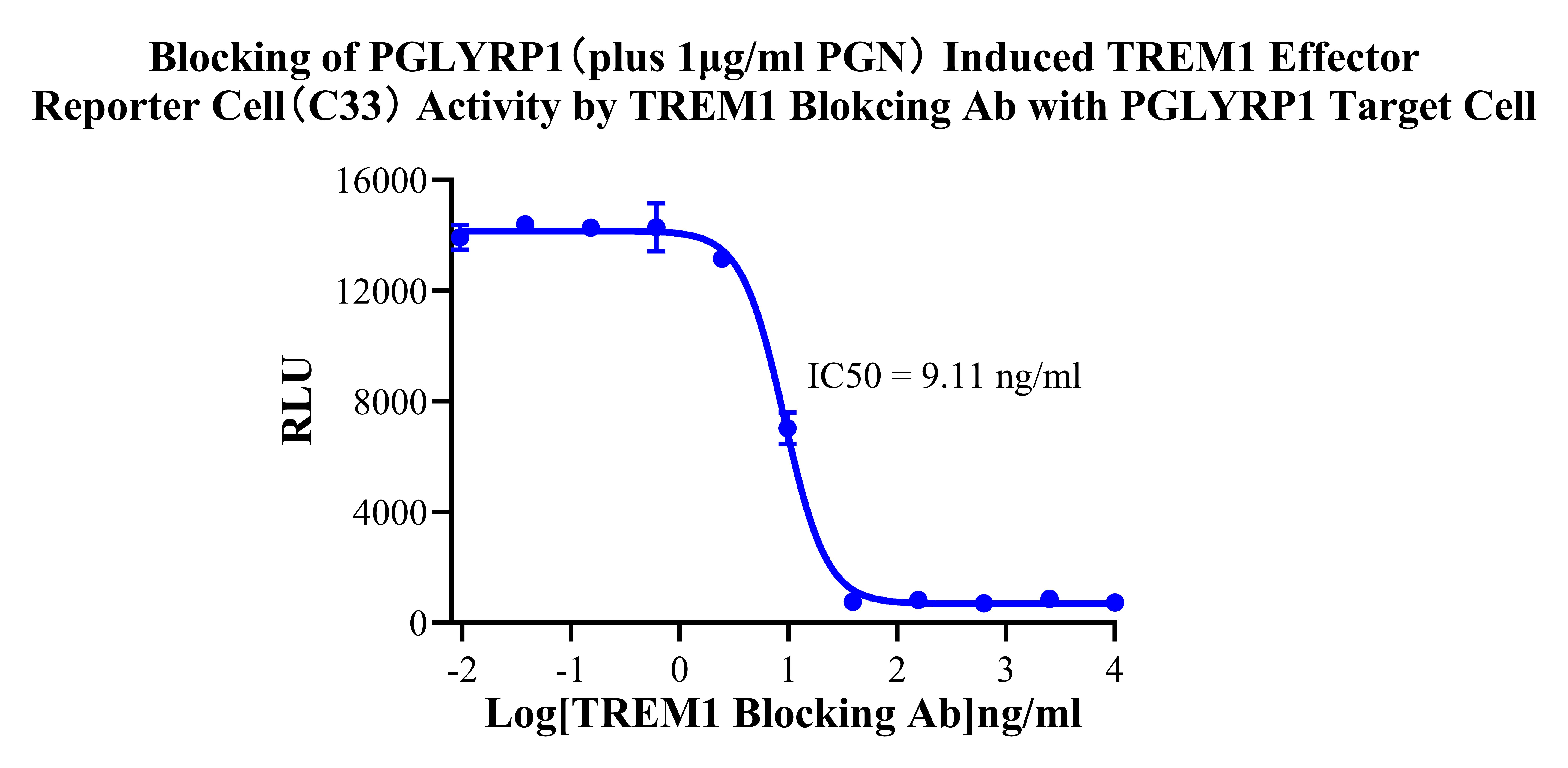 Figure 2. Blocking of PGLYRP1 (plus 1μg/ml PGN) Induced TREM1 Effector Reporter Cell(C33) Activity by TREM1 Blokcing Ab with PGLYRP1 Target Cell . |
