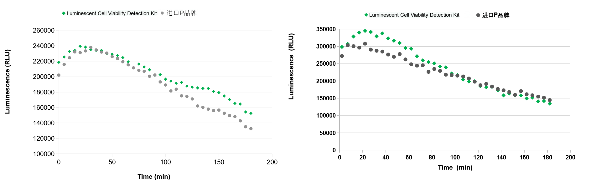 2. 半衰期 ![]() Figure 3. 生物發(fā)光穩(wěn)定性的檢測(cè)。分別使用Luminescent Cell Viability Detection Kit和進(jìn)口P公司同類(lèi)對(duì)照對(duì)2萬(wàn)個(gè)/孔CTLL-2細(xì)胞(左圖)和5萬(wàn)個(gè)/孔UC-MSC細(xì)胞(右圖)進(jìn)行持續(xù)3小時(shí)的生物發(fā)光強(qiáng)度檢測(cè)。