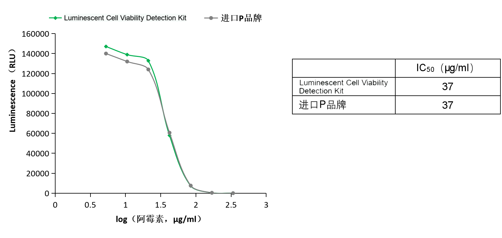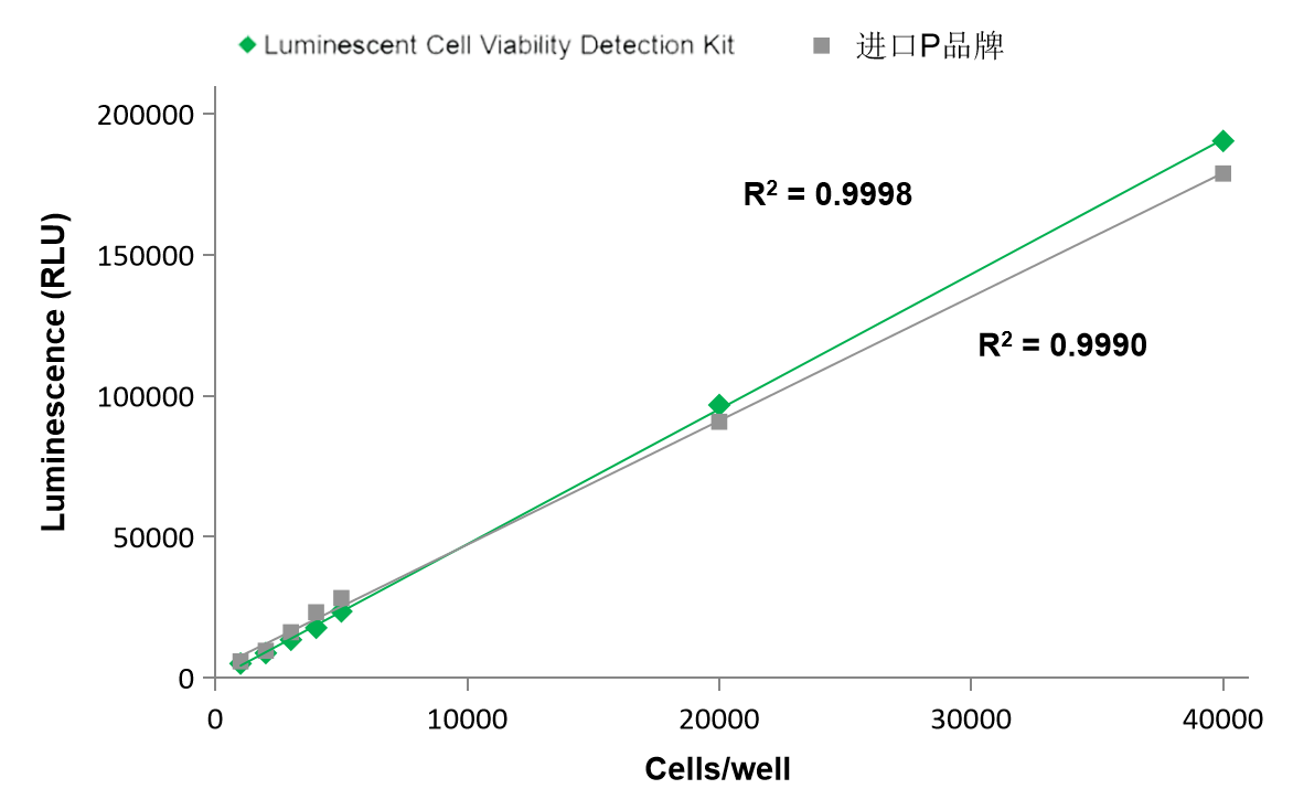 3. 線性 ![]() Figure 4. 比較不同細(xì)胞數(shù)的線性范圍。分別使用Luminescent Cell Viability Detection Kit和進(jìn)口P公司同類(lèi)對(duì)照檢測(cè)不同數(shù)量CHO-K1細(xì)胞(CD-CHO培養(yǎng)基)在黑色96孔板中生物發(fā)光強(qiáng)度,制成標(biāo)準(zhǔn)曲線。