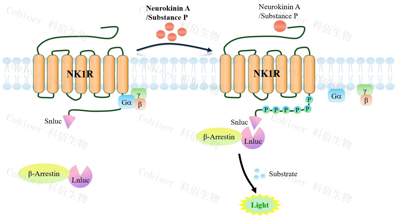 NK1R β-Arrestin CHO 報(bào)告基因藥靶模型很好的模擬了體內(nèi) NK1R/β-Arrestin 的信號(hào)轉(zhuǎn) 導(dǎo)過(guò)程,原理見(jiàn)下圖所示。當(dāng)缺乏配體刺激時(shí),β-Arrestin 不與 NK1R 結(jié)合,融合β-Arrestin的熒光素酶處于失活構(gòu)象,當(dāng) NK1R 遭遇配體刺激時(shí),融合熒光素酶報(bào)告基因的β-Arrestin 被招募,使熒光素酶報(bào)告基因處于激活狀態(tài),加入其底物后發(fā)光信號(hào)增強(qiáng)。![]() Figure 1. NK1R β-Arrestin CHO 細(xì)胞模型原理圖 |