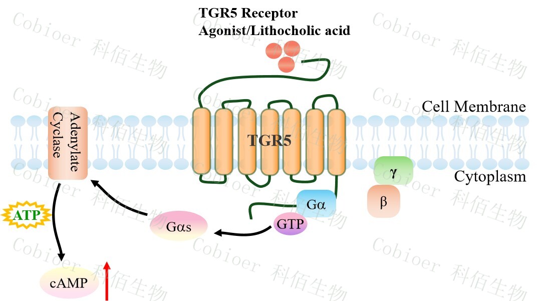 cAMP 在 G 蛋白偶聯(lián)受體(GPCR)信號(hào)轉(zhuǎn)導(dǎo)中是一種關(guān)鍵的第二信使。當(dāng)配體結(jié)合 到 GPCR,構(gòu)象發(fā)生變化,激活受體接著激活 G 蛋白,Gs 的激活導(dǎo)致腺苷酸環(huán)化酶調(diào)控 cAMP 的升高。GPBAR1(TGR5) CHO 細(xì)胞藥靶模型很好的模擬了體內(nèi) GPBAR1(TGR5)的 信號(hào)轉(zhuǎn)導(dǎo)過程,原理見下圖所示。