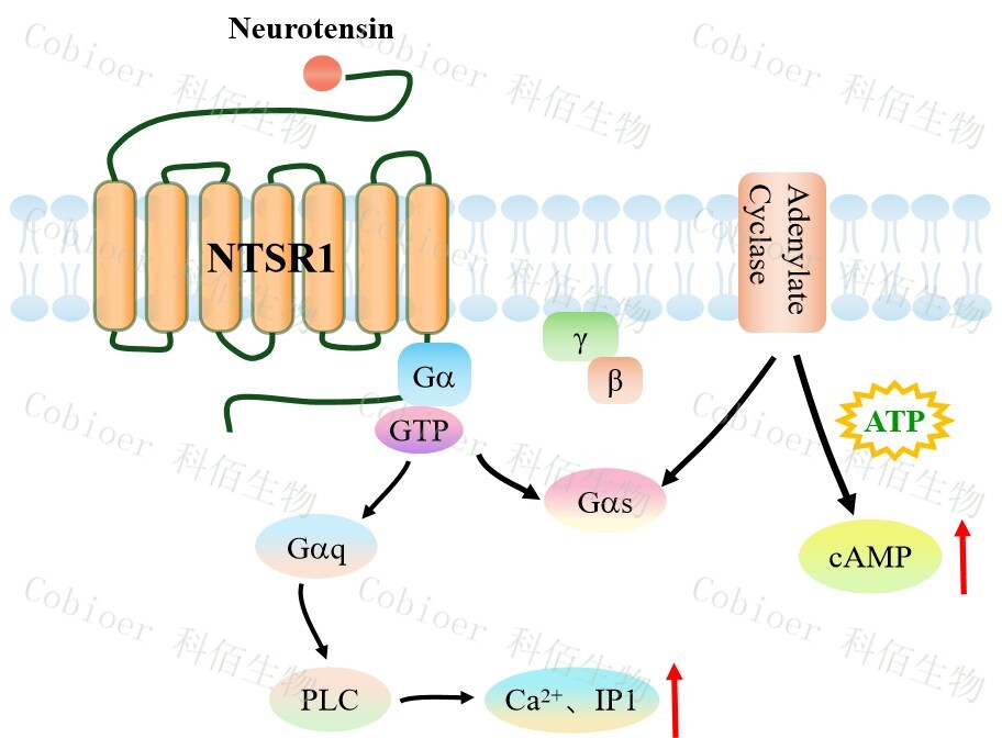 | cAMP 在 G 蛋白偶聯(lián)受體(GPCR)信號轉導中是一種關鍵的第二信使。當配體結合 到 GPCR,構象發(fā)生變化,激活受體接著激活 G 蛋白,Gs 的激活導致腺苷酸環(huán)化酶調(diào)控 cAMP 的升高。 NTSR1 還可以通過 Gq 蛋白的信號通路,調(diào)控 IP1 的升高。NTSR1 與配體結合,導致 Gαq 亞基的激活,觸發(fā) PLC-γ,從而產(chǎn)生兩個第二信使:IP3 和 DAG,它們參與細胞內(nèi)鈣 動員。由于 IP3 在代謝上不穩(wěn)定,因此測量通路激活的替代標志物 IP1 作為檢測標準。 NTSR1 CHO 細胞藥靶模型很好的模擬了體內(nèi) NTSR1 的信號轉導過程,原理見下圖所示。 ![]() Figure 1. NTSR1 CHO 細胞模型原理圖 |