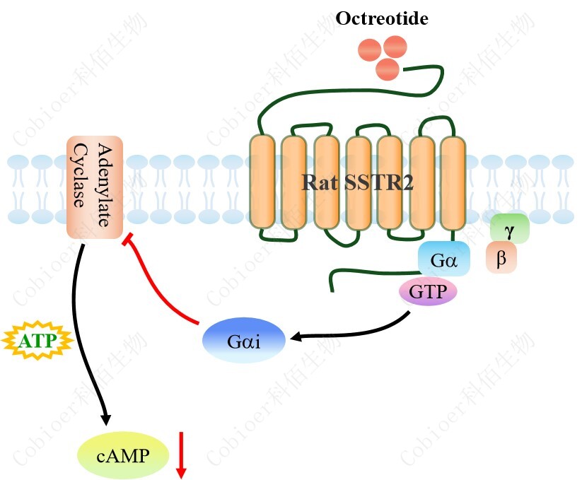cAMP 在 G 蛋白偶聯(lián)受體(GPCR)信號(hào)轉(zhuǎn)導(dǎo)中是一種關(guān)鍵的第二信使。當(dāng)配體結(jié)合 到 GPCR,構(gòu)象發(fā)生變化,激活受體接著激活 G 蛋白,Gi 的激活導(dǎo)致腺苷酸環(huán)化酶調(diào)控 cAMP 的下調(diào)。Rat SSTR2 CHO 藥靶模型很好的模擬了體內(nèi) SSTR2 的信號(hào)轉(zhuǎn)導(dǎo)過(guò)程,原理 見(jiàn)下圖所示。![]() Figure 1. Rat SSTR2 CHO 細(xì)胞模型原理圖 |