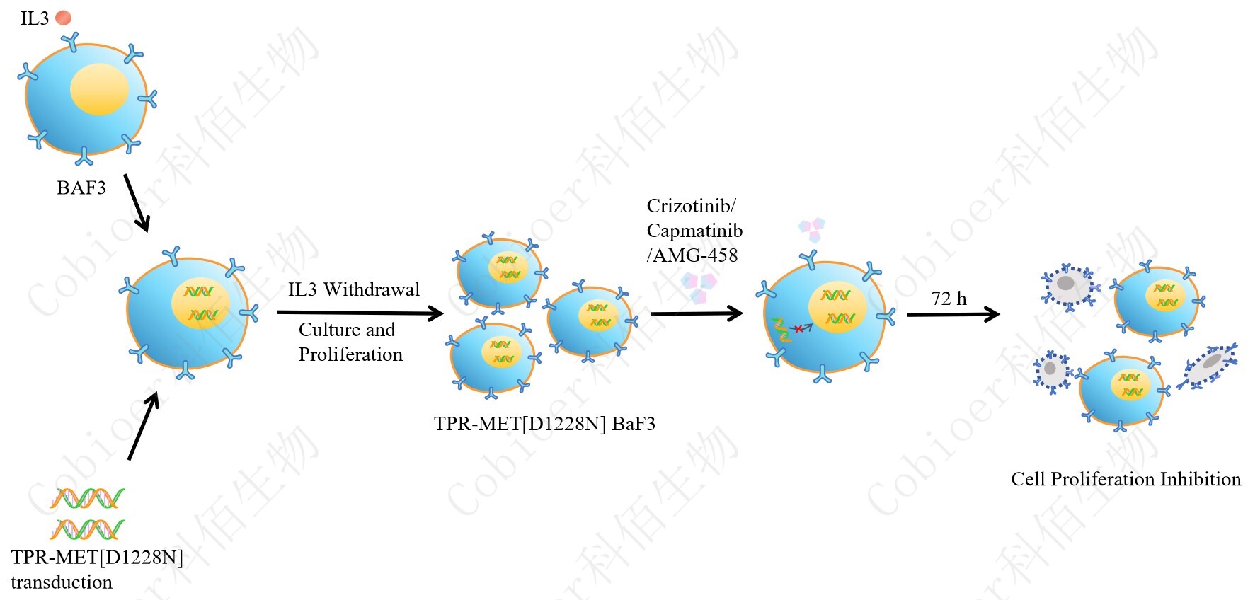 BaF3(小鼠原 B 細(xì)胞)的生長和增殖需要 IL-3 的維持。通過引入各種表達(dá)激酶的基因, 能作為 BaF3 的驅(qū)動基因,讓 BaF3 不再依賴 IL-3 而增殖,進(jìn)而激酶基因成為 BaF3 增殖依 賴的驅(qū)動基因,用于評估小分子藥物對激酶的靶向抑制作用,原理及流程見下圖所示。![]() Figure 1. TPR-MET[D1228N] BaF3 細(xì)胞的構(gòu)建原理圖 |