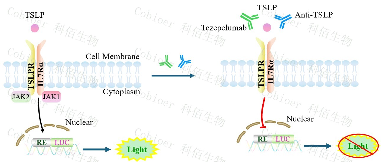 TSLP Effector Reporter Cell 報告基因藥靶模型很好的模擬了體內 TSLP 的信號轉導過(guò)程,原理見(jiàn)下圖所示。![]() Figure 1. TSLP Effector Reporter Cell 細胞模型原理圖 |