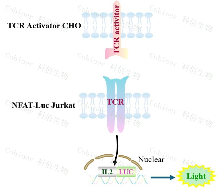 TCR Activator CHO 報告基因藥靶模型很好的模擬了體內 TCR 的信號轉導過(guò)程,原理見(jiàn)下圖所示。![]() Figure 1. TCR Activator CHO 細胞模型原理圖 |