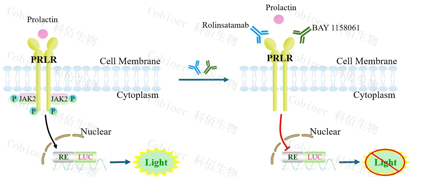 PRL Effector Reporter Cell 報告基因藥靶模型很好的模擬了體內 PRL 的信號轉導過(guò)程, 原理見(jiàn)下圖所示。![]() Figure 1. PRL Effector Reporter Cell 模型原理圖 |