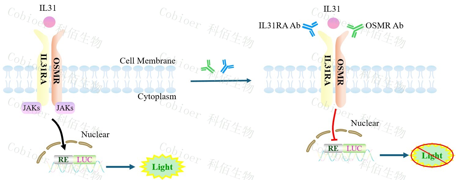 IL31 Effector Reporter報告基因藥靶模型很好的模擬了體內 IL31的信號轉導過(guò)程,原理見(jiàn)下圖所示。![]() Figure 1. IL31 Effector Reporter Cell 細胞模型原理圖