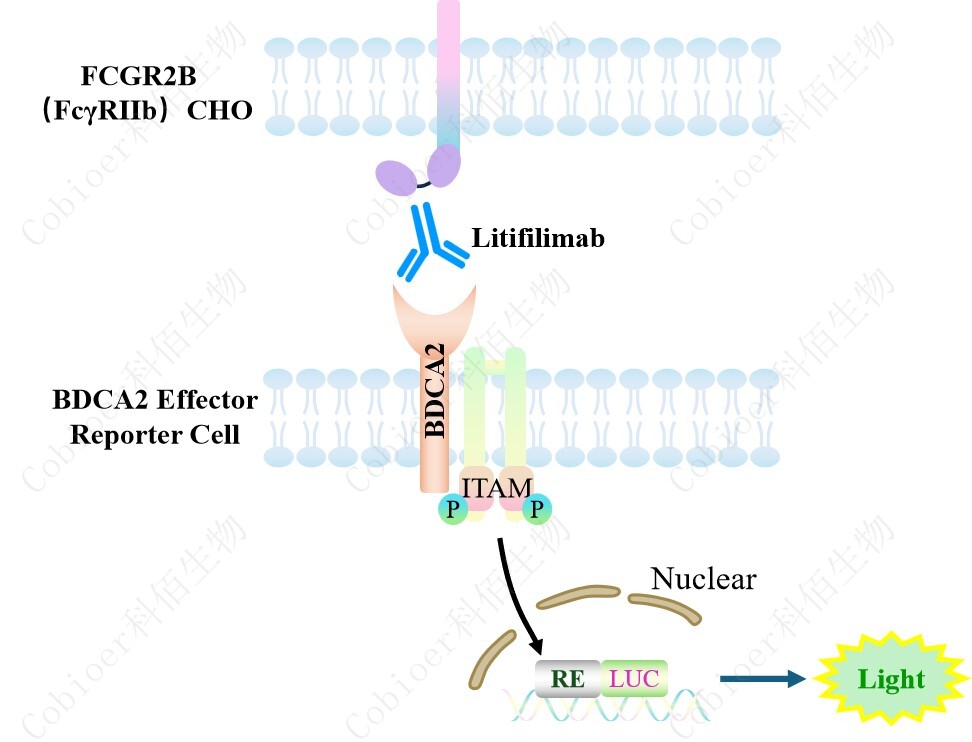 BDCA2 Effector Reporter 報告基因藥靶模型很好的模擬了體內 BDCA2 的信號轉導過(guò)程, 原理見(jiàn)下圖 所示。![]() Figure 1. BDCA2 Effector Reporter 細胞模型原理圖