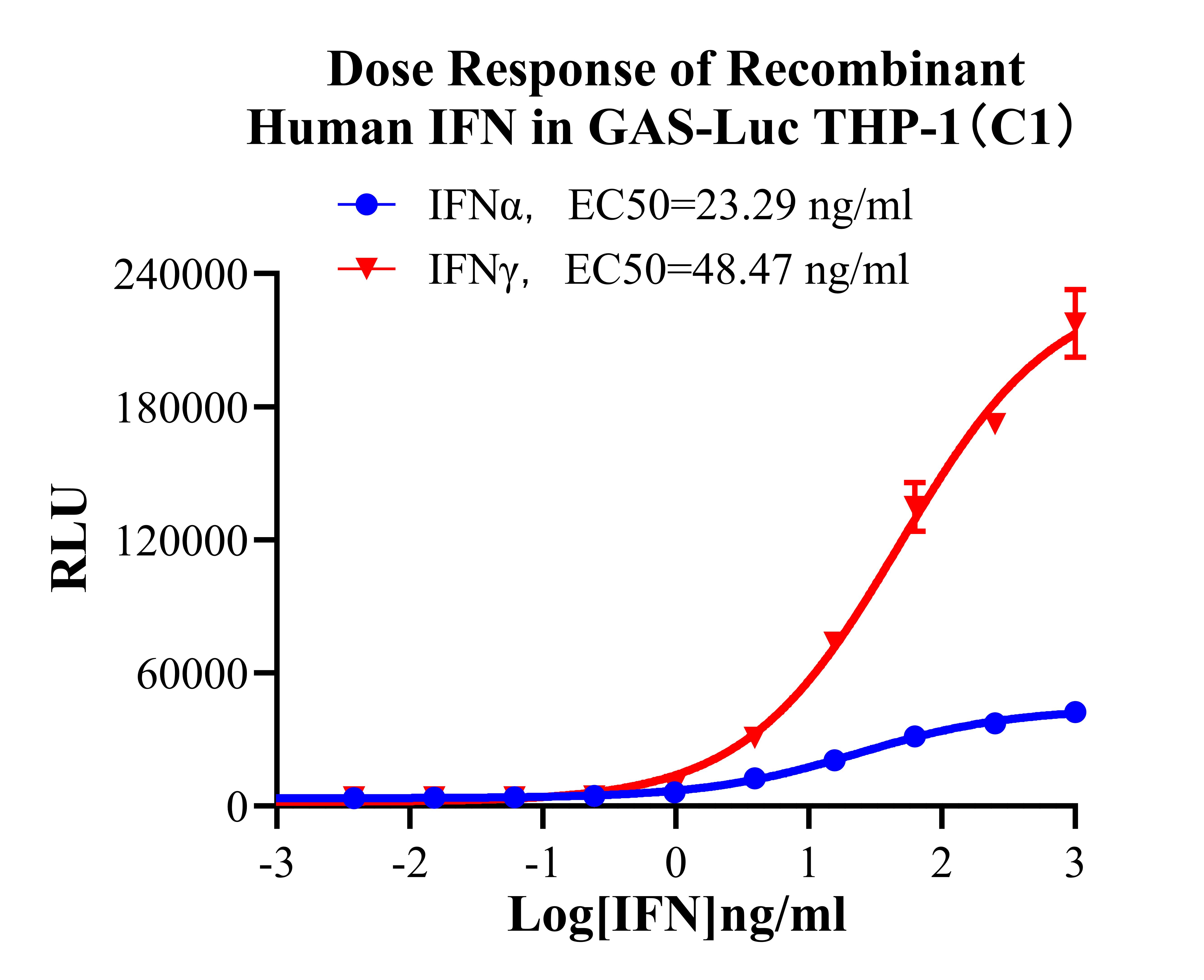 GAS-Luc THP-1 報告基因細胞,是由 GAS 調控并表達 Luc 熒光素酶報告基因的 THP-1 細胞。IFN 與受體結合,激活 GAS 的原理見(jiàn)下圖所示。