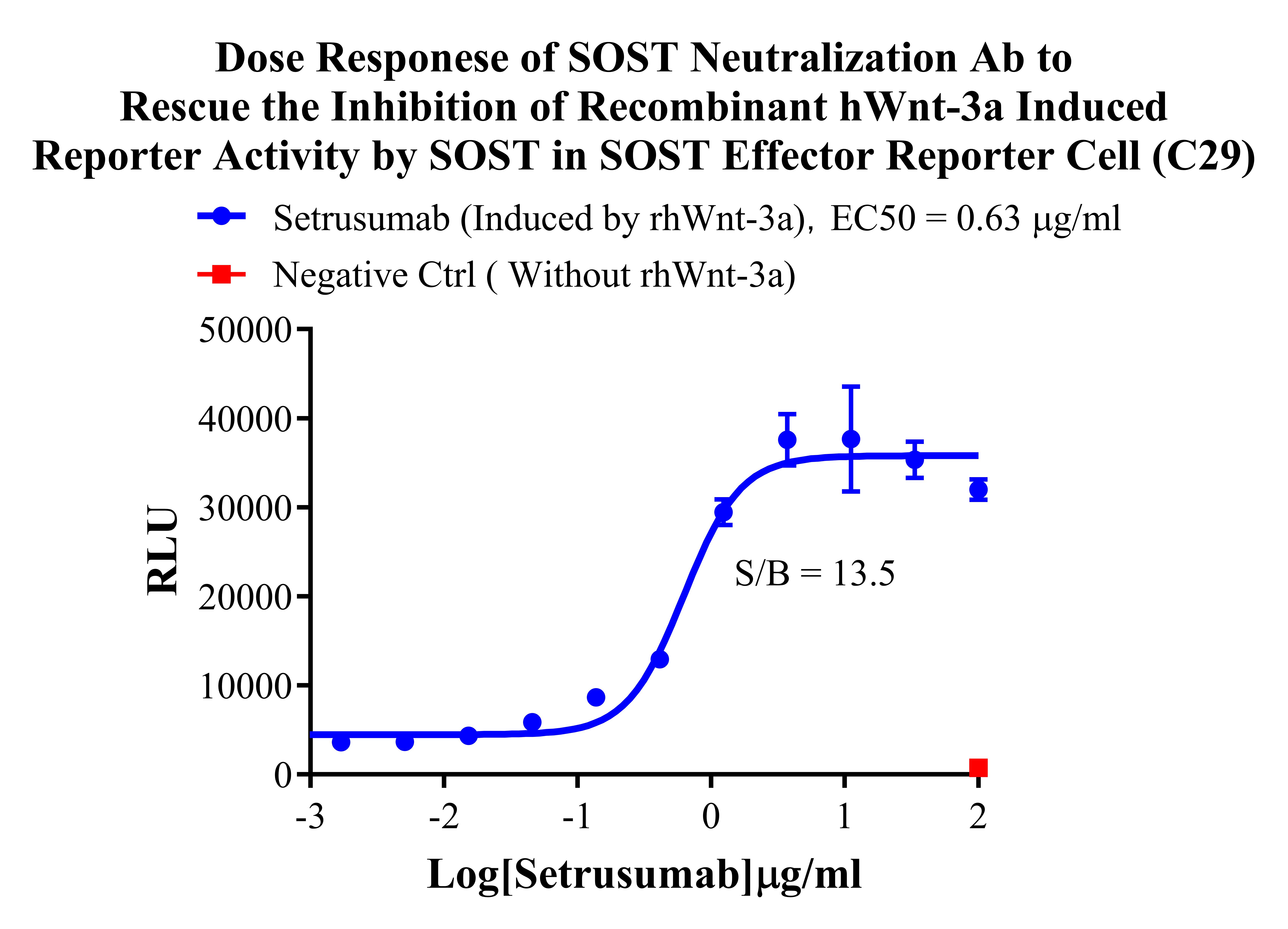 Figure 1. Dose Responese of SOST Neutralization Ab to Rescue the Inhibition of Recombinant hWnt-3a Induced Reporter Activity by SOST in SOST Effector Reporter Cell (C29).