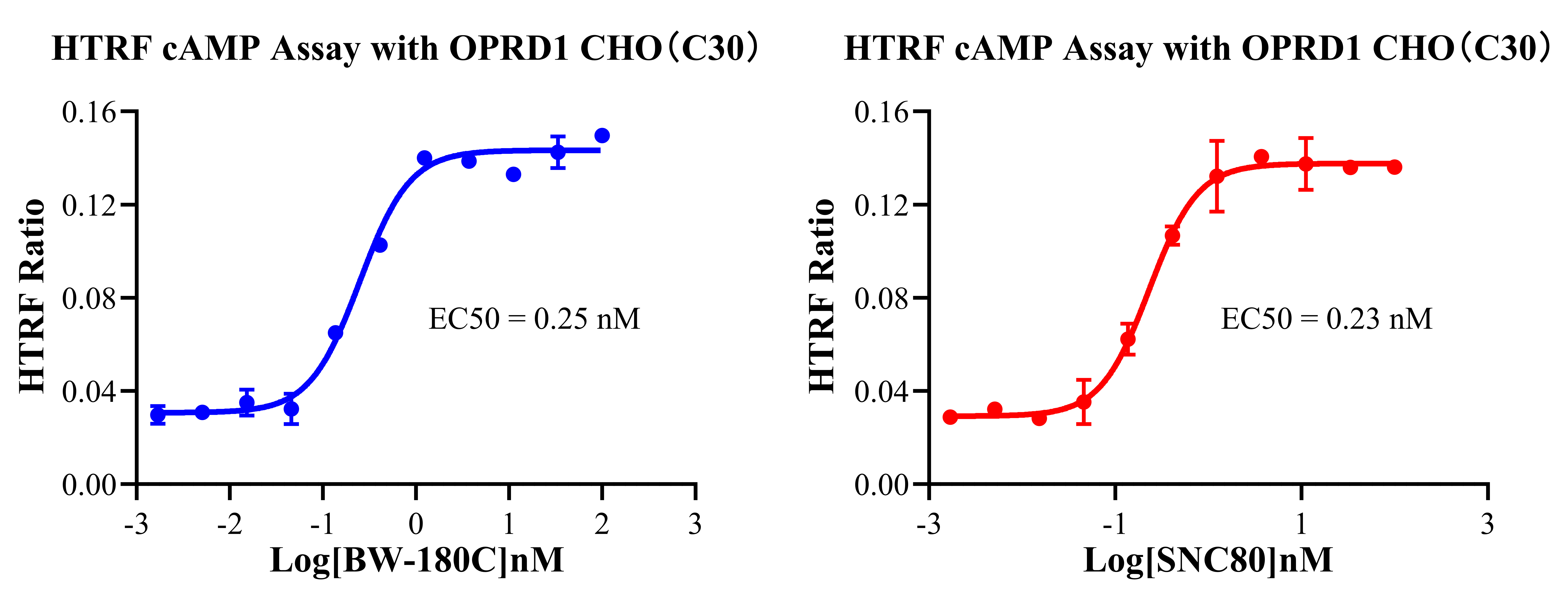 cAMP 在 G 蛋白偶聯(lián)受體(GPCR)信號轉導中是一種關(guān)鍵的第二信使。當配體結合到 GPCR,構象發(fā)生變化,激活受體接著(zhù)激活 G 蛋白,Gi 的激活導致腺苷酸環(huán)化酶調控 cAMP 的下調。OPRD1 CHO 藥靶模型很好的模擬了體內 OPRD1 的信號轉導過(guò)程,原理見(jiàn)下圖所示。 |