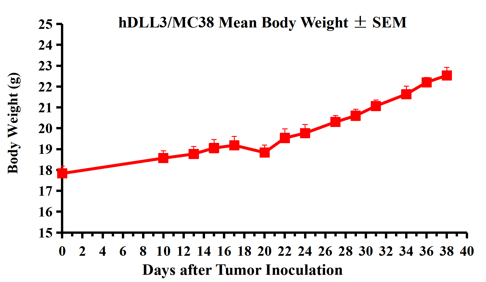 Figure 2. hDLL3/MC38 Mean Body Weight ± SEM.