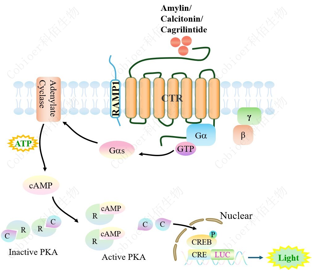 CTR&RAMP1 CRE-Luc HEK293 報告基因藥靶模型很好的模擬了體內 CTR&RAMP1 的信號轉導過(guò)程,原理見(jiàn)下圖所示。