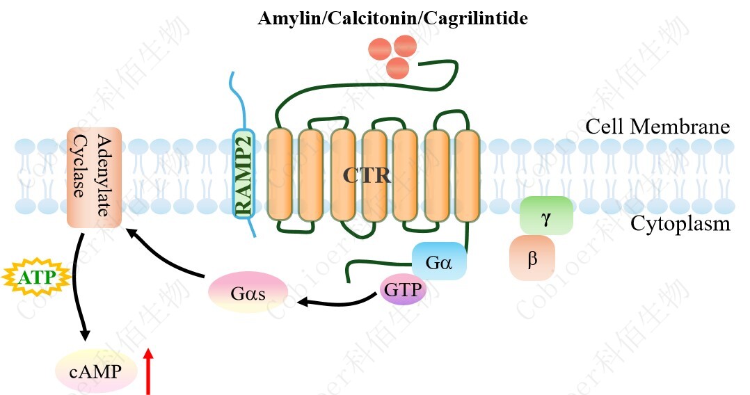 cAMP 在 G 蛋白偶聯(lián)受體(GPCR)信號轉導中是一種關(guān)鍵的第二信使。當配體結合 到 GPCR,構象發(fā)生變化,激活受體接著(zhù)激活 G 蛋白,Gs 的激活導致腺苷酸環(huán)化酶調控 cAMP 的升高。