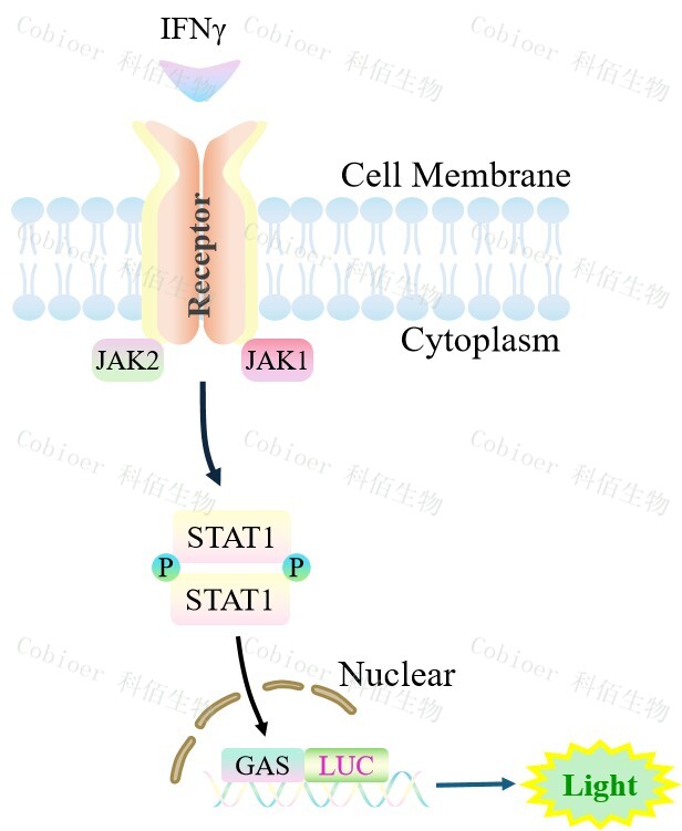 GAS-Luc HEK293 報告基因細胞,是由 GAS 調控并表達 Luc 熒光素酶 報告基因的 HEK293 細胞。IFNγ與受體結合,激活 GAS 的原理見(jiàn)下圖所示。