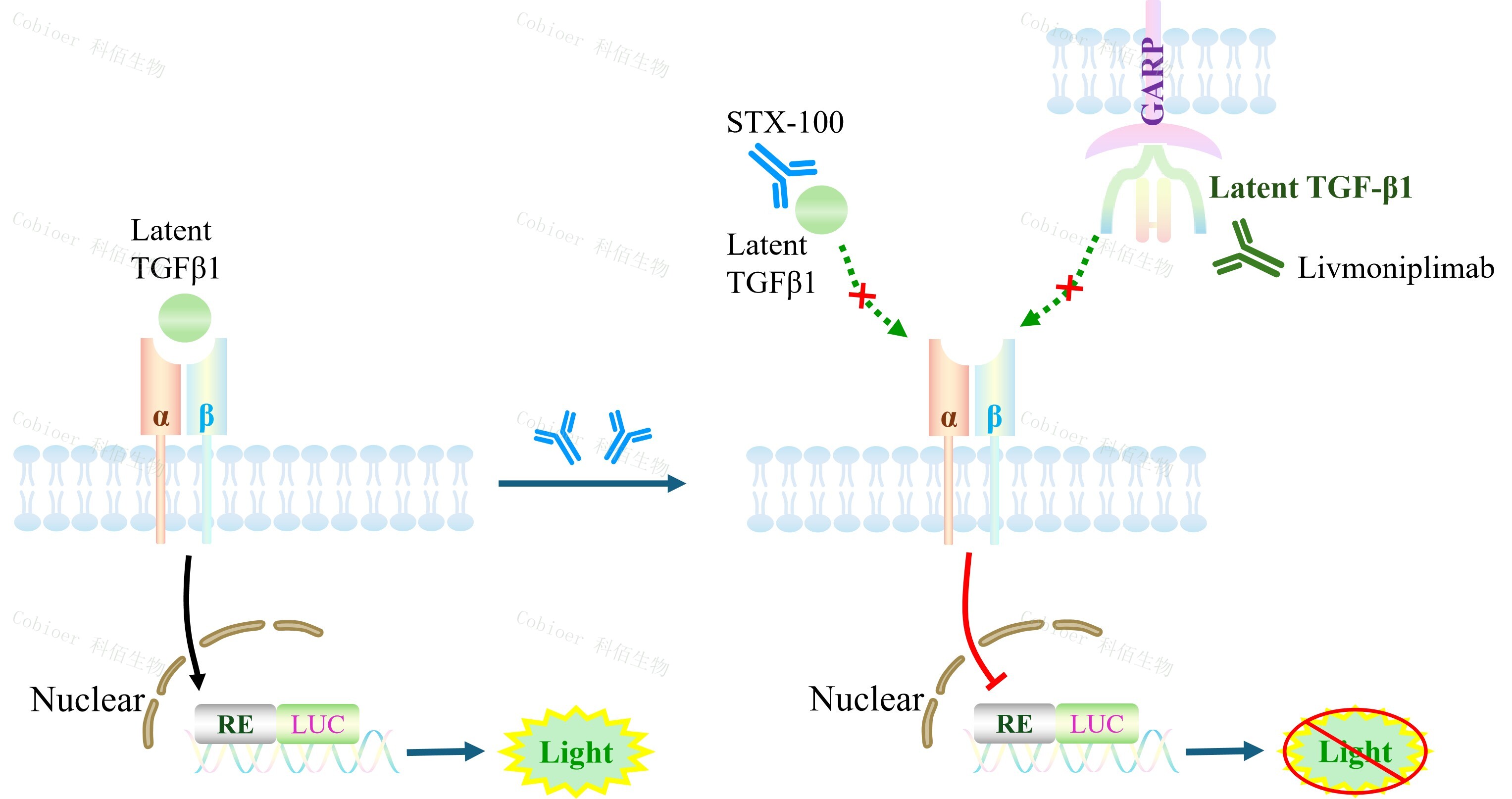 Integrin αvβ6 Effector Reporter Cell 報(bào)告基因藥靶模型很好的模擬了體內(nèi)αvβ6 的信號轉(zhuǎn) 導(dǎo)過程,原理見下圖所示。