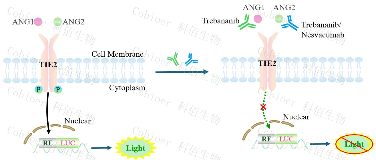 ANG/TIE2 Effector Reporter Cell 報告基因藥靶模型很好的模擬了體內 ANG/TIE2 的信 號轉導過(guò)程,原理見(jiàn)下圖所示。![]() Figure 1. ANG/TIE2 Effector Reporter Cell 細胞模型原理圖