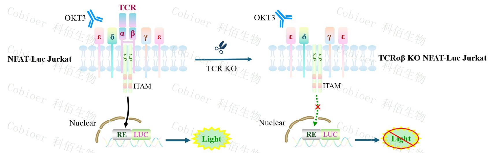 TCRαβ KO NFAT-Luc Jurkat 報(bào)告基因藥靶模型很好的模擬了體內(nèi) TCR 的信號(hào)轉(zhuǎn)導(dǎo)過程, 原理見下圖所示。![]() Figure 1. TCRαβ KO NFAT-Luc Jurkat 細(xì)胞模型原理圖 |