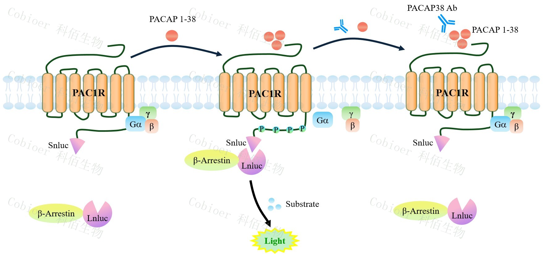 PAC1R β-Arrestin CHO 報告基因藥靶模型很好的模擬了體內(nèi) PAC1R/β-Arrestin 的信號轉(zhuǎn)導(dǎo)過程,原理見下圖所示。當缺乏配體刺激時,β-Arrestin 不與 PAC1R 結(jié)合,融合β- Arrestin 的熒光素酶處于失活構(gòu)象,當 PAC1R 遭遇配體刺激時,融合熒光素酶報告基因的 β-Arrestin 被招募,使熒光素酶報告基因處于激活狀態(tài),加入其底物后發(fā)光信號增強。![]() Figure 1. PAC1R β-Arrestin CHO 細胞模型原理圖 |