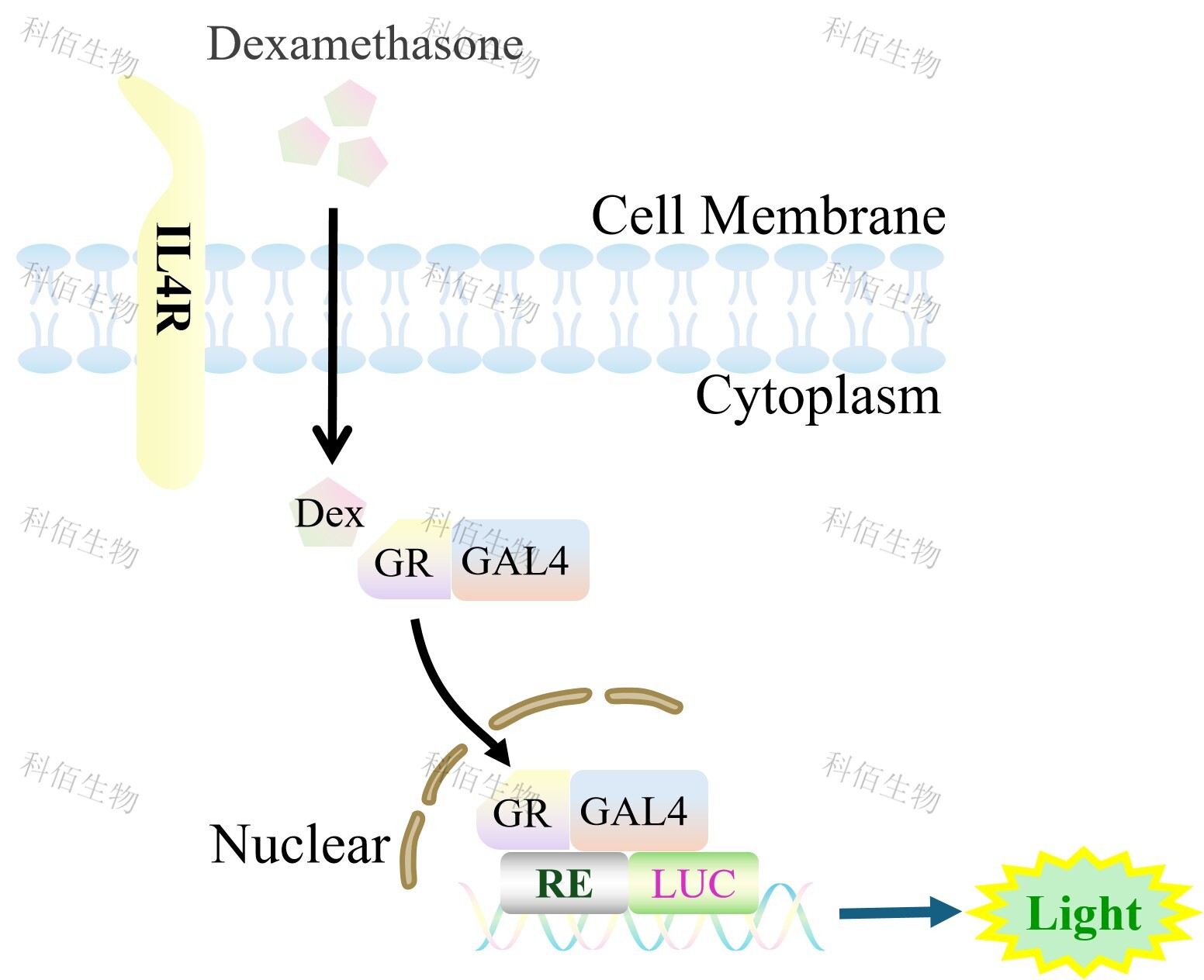 Figure 1. IL4R(High expression)&GR-GAL4 Luciferase Reporter HEK293 細(xì)胞原理示意圖