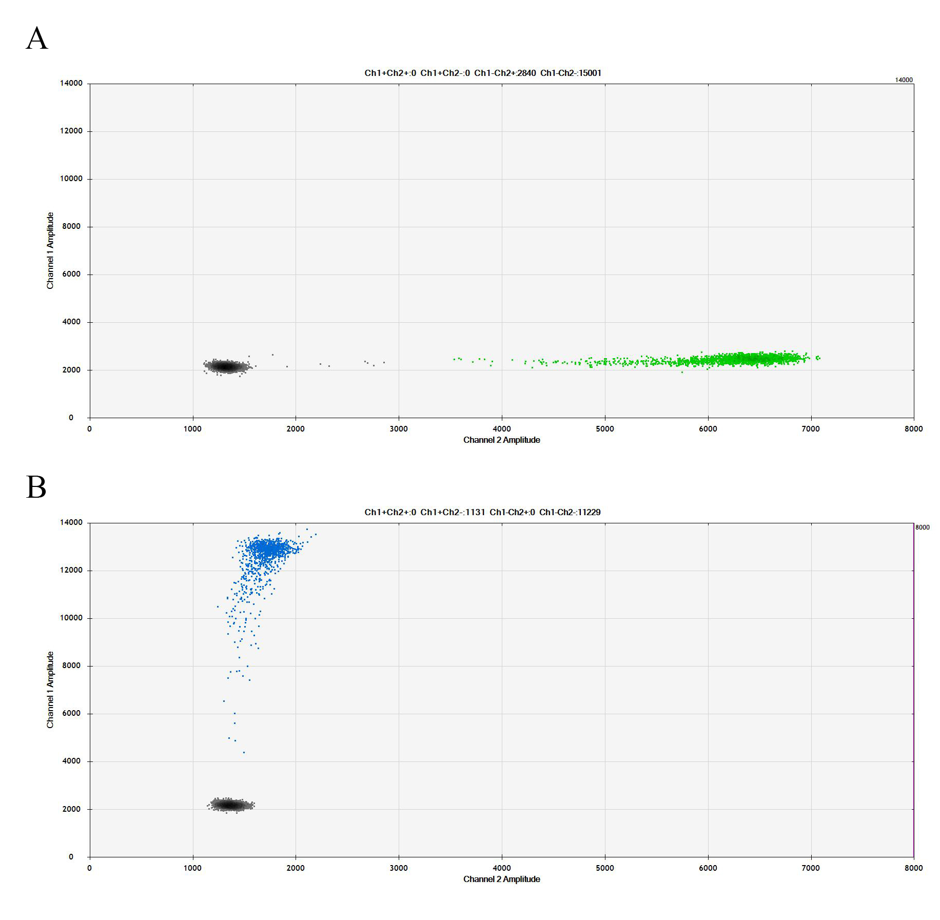 A:RKO Parental Cell;B:WRN[C727S](Homozygous,AF%:100) Isogenic RKO 通道1藍(lán)色微滴代表WRN[C727S]突變陽性,通道2綠色微滴代表該位點(diǎn)為陰性野生型