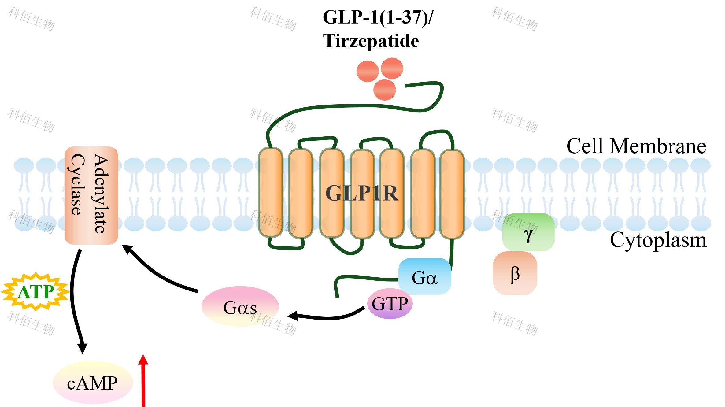 cAMP 在 G 蛋白偶聯(lián)受體(GPCR)信號轉(zhuǎn)導中是一種關(guān)鍵的第二信使。當配體結(jié)合到 GPCR,構(gòu)象發(fā)生變化,激活受體接著激活 G 蛋白,Gs 的激活導致腺苷酸環(huán)化酶調(diào)控 cAMP 的升高。GLP1R 藥靶模型很好的模擬了體內(nèi) GLP1R 的信號轉(zhuǎn)導過程,原理見下圖所示。