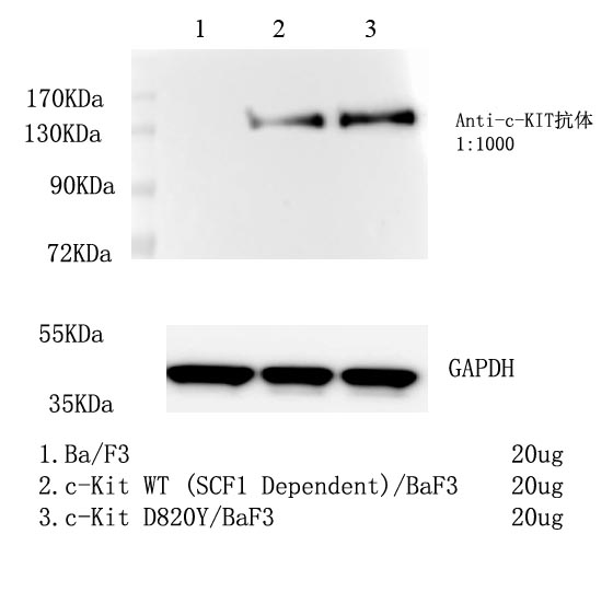 KIT D820Y lies within the protein kinase domain of the Kit protein (UniProt.org). D820Yresuts in constitutive phosphorylation of Kit and is transforming in cell culture, and has also been identified as a secondary mutation associated with imatinib-resistance. | |