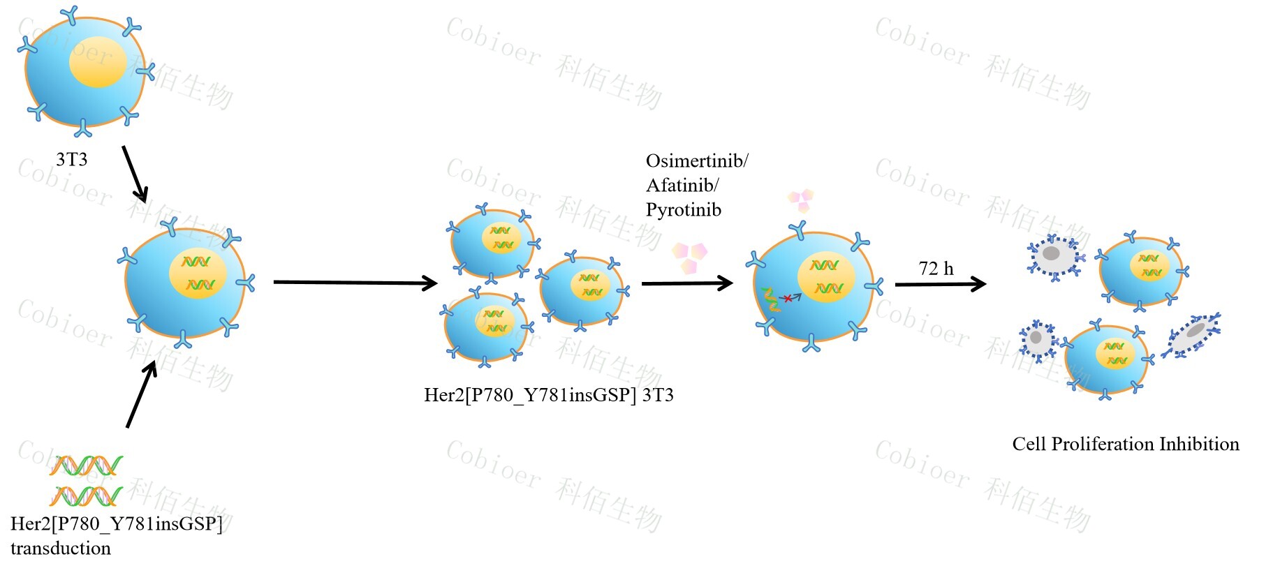 HER2[P780_Y781insGSP] 3T3 藥靶細(xì)胞 , 通過轉(zhuǎn)導(dǎo)突變狀態(tài)的 HER2[P780_Y781insGSP] 基因到 3T3 細(xì)胞系中 , 穩(wěn)定表達(dá)人突變形態(tài)下的 HER2[P780_Y781insGSP]基因,原理及流程見下圖所示。