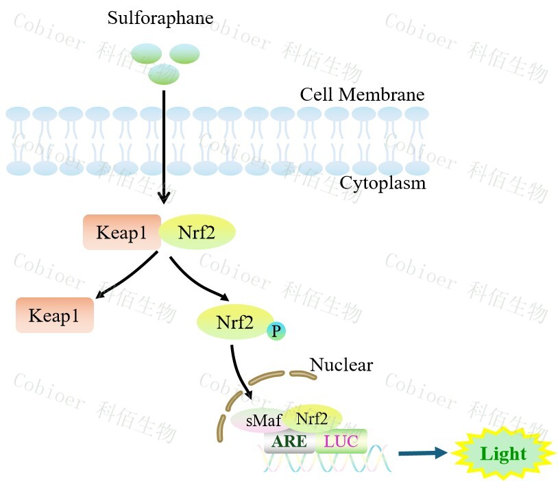 ARE-Luc(Nrf2 Antioxidant Pathway) HEK293 報告基因細胞,是由 ARE 調控并表達 Luc 熒光素酶報告基因的 HEK293 細胞。Sulforaphane 是 Keap1/Nrf2/ARE 的誘 導劑,原理見(jiàn)下圖所示。