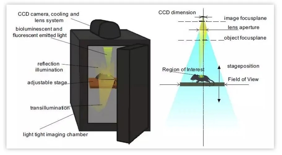 6. 活體成像:動(dòng)物經(jīng)麻醉(氣麻/針麻)后放入成像暗箱平臺,開(kāi)啟照明燈(明場(chǎng))拍攝背景圖。關(guān)閉照明燈,在沒(méi)有外界光源的條件下(暗場(chǎng))拍攝由小鼠體內發(fā)出的特異性光子。明場(chǎng)與暗場(chǎng)的背景圖疊加后可以直觀(guān)的顯示動(dòng)物體內特異光子的部位和強度,完成成像操作。值得注意的是熒光成像需要選擇合適的激發(fā)光和發(fā)射光濾光片,生物發(fā)光則需要成像前注射luciferase底物。