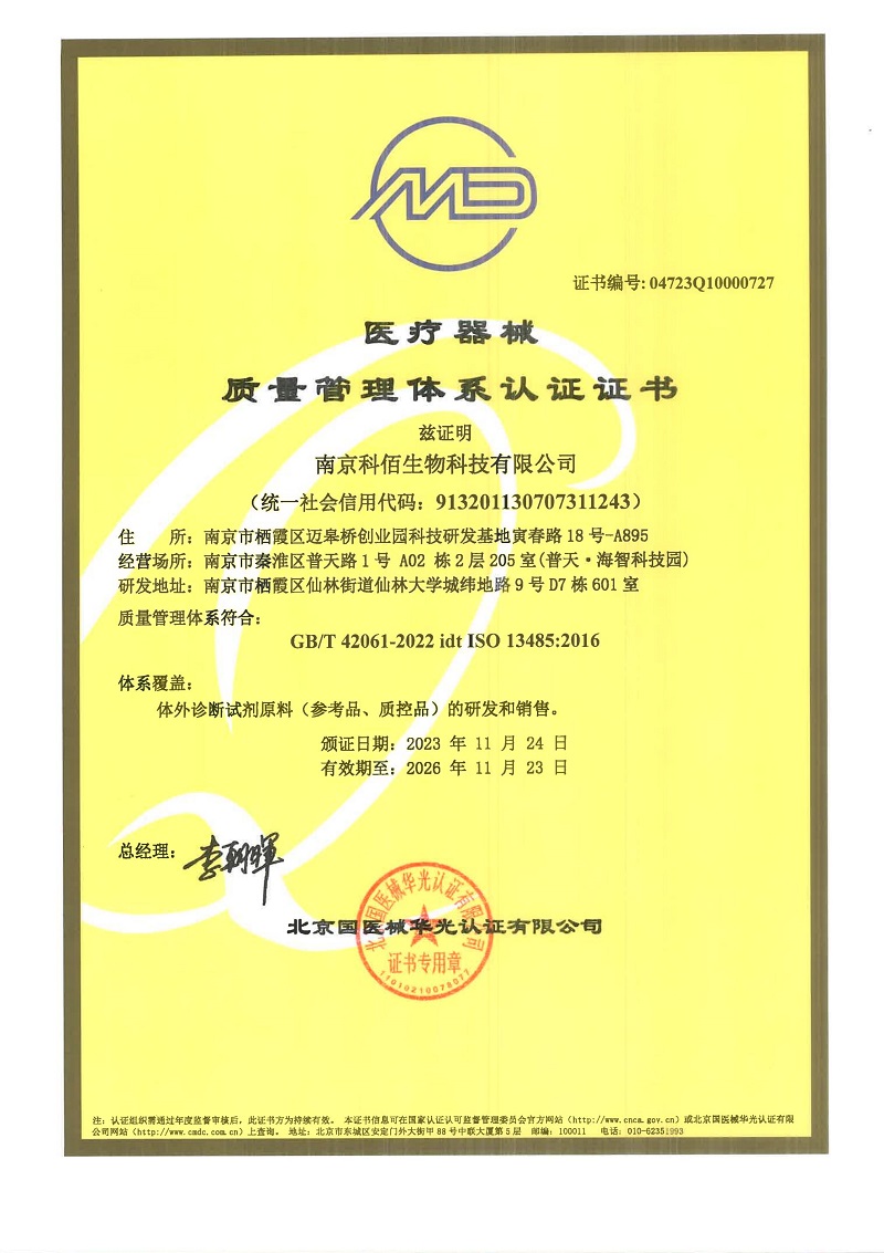 ISO 13485:2016 認證范圍:體外診斷試劑原料(參考品、質(zhì)控品) 的研發(fā)和銷(xiāo)售。