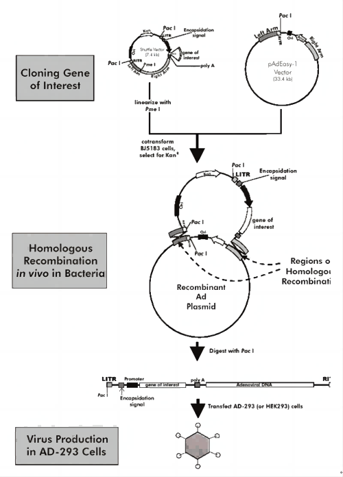 AdEasy包裝系統主要的特點(diǎn)是利用Cre/loxP系統在大腸桿菌(BJ5183)中完成外源基因插入腺病毒基因組的過(guò)程,獲得環(huán)狀的重組腺病毒基因組,并且具有在細菌中復制的必需元件。將重組腺病毒基因組酶切線(xiàn)性化后轉染HEK293細胞,避免了雙質(zhì)粒共轉染得到重組腺病毒。