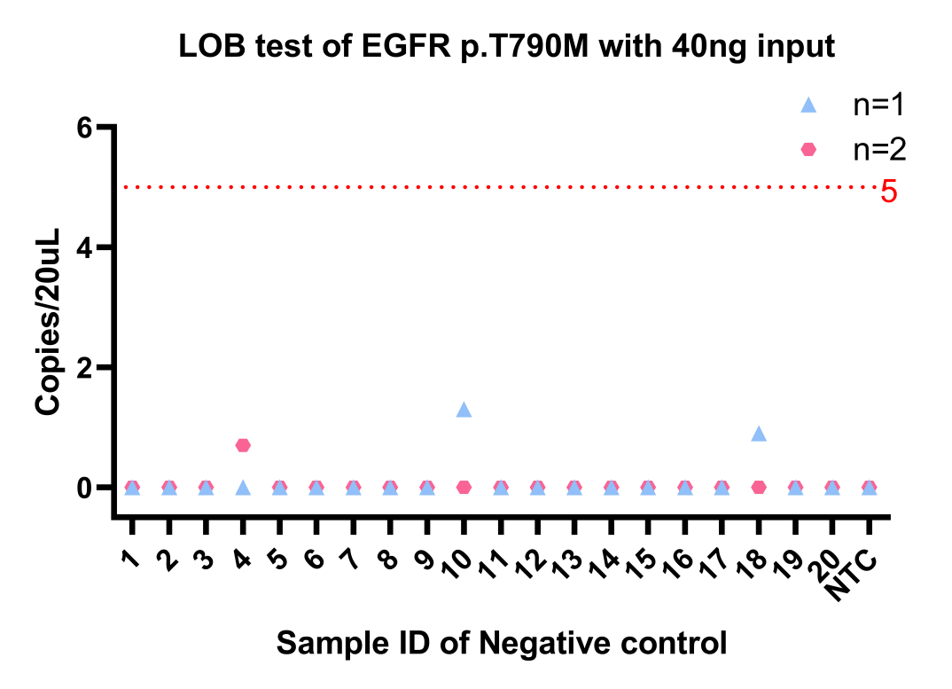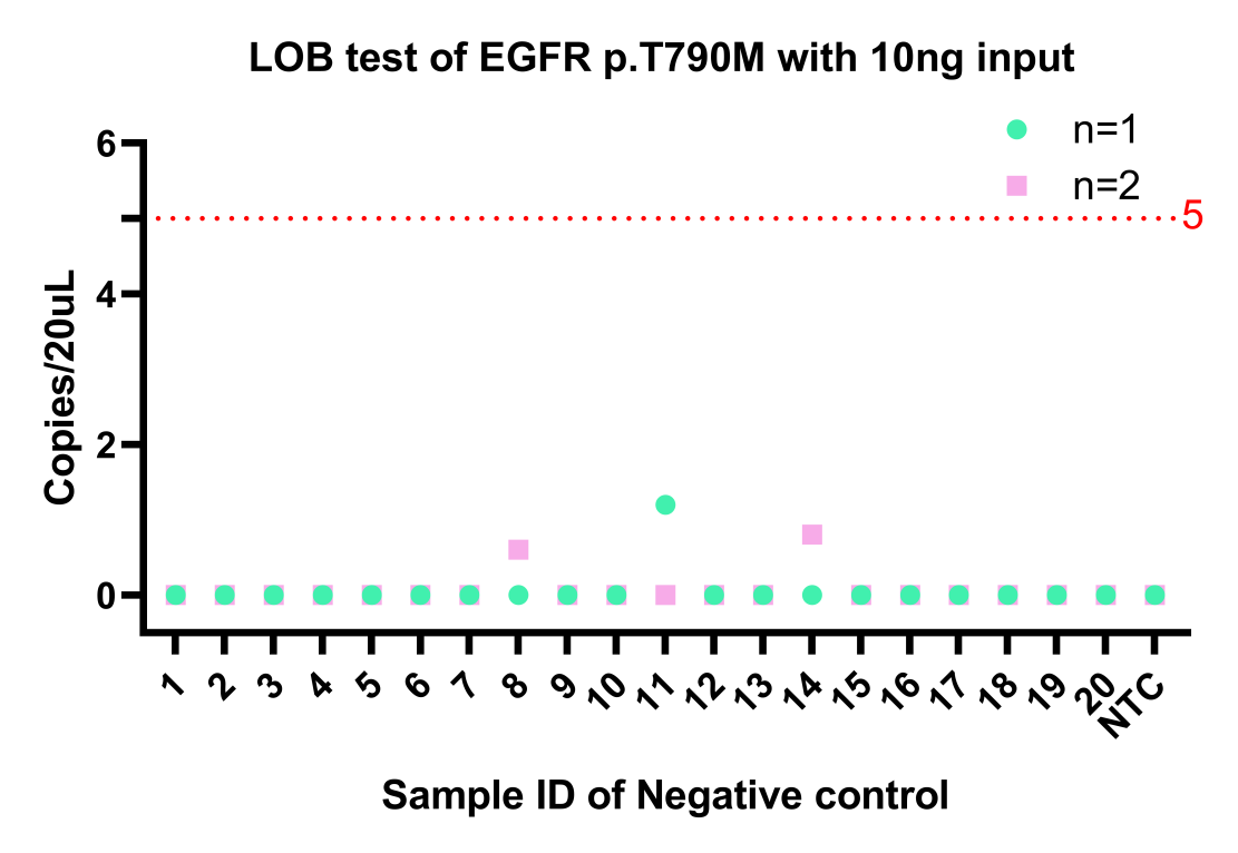 首先使用EGFR T790M的對應的陰性標準品,對50%的標準品進(jìn)行有限稀釋?zhuān)總€(gè)梯度使用陰性樣本兩倍稀釋?zhuān)又?zhù)對11個(gè)樣本進(jìn)行檢測。
