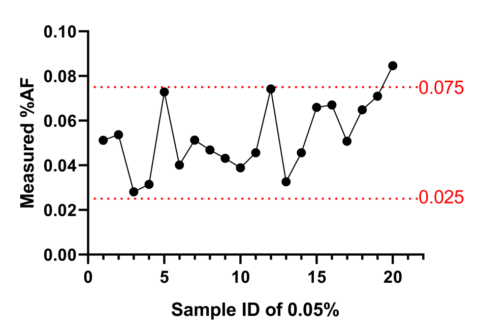對20個(gè)0.05%的樣本進(jìn)行數字PCR檢測,觀(guān)察在0.025-0.075%以?xún)仁欠襁_成95%檢出。
