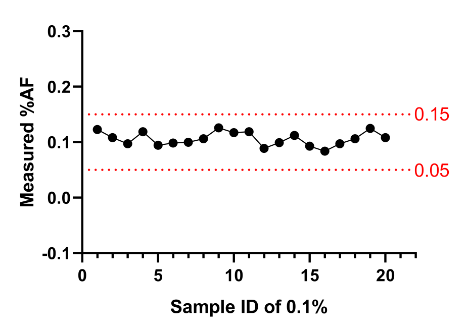 對20個(gè)0.1%的樣本進(jìn)行數字PCR檢測,觀(guān)察在0.05-0.15%以?xún)仁欠襁_成95%檢出。