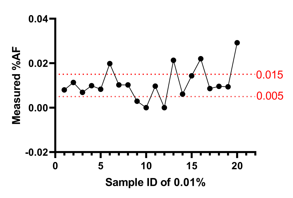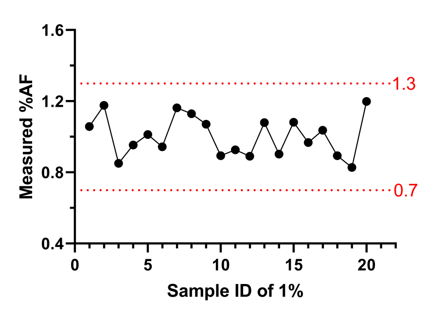 由上數據可見(jiàn):在10ng的投入量下,AF%呈現非常好的線(xiàn)性稀釋?zhuān)嬖诓▌?dòng),但是都在誤差范圍內。
