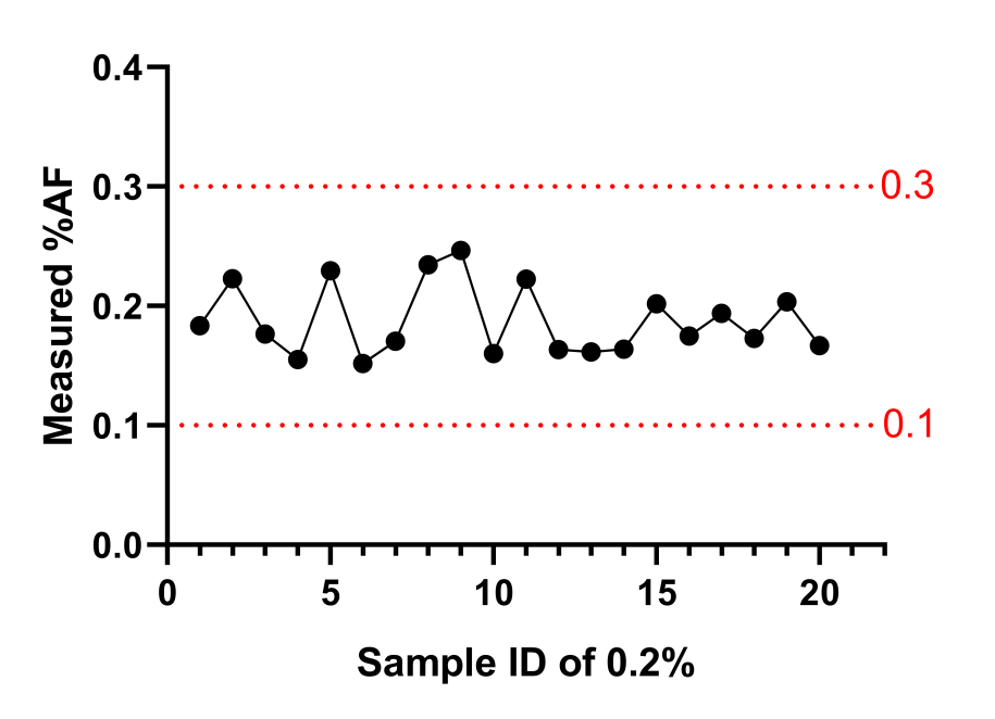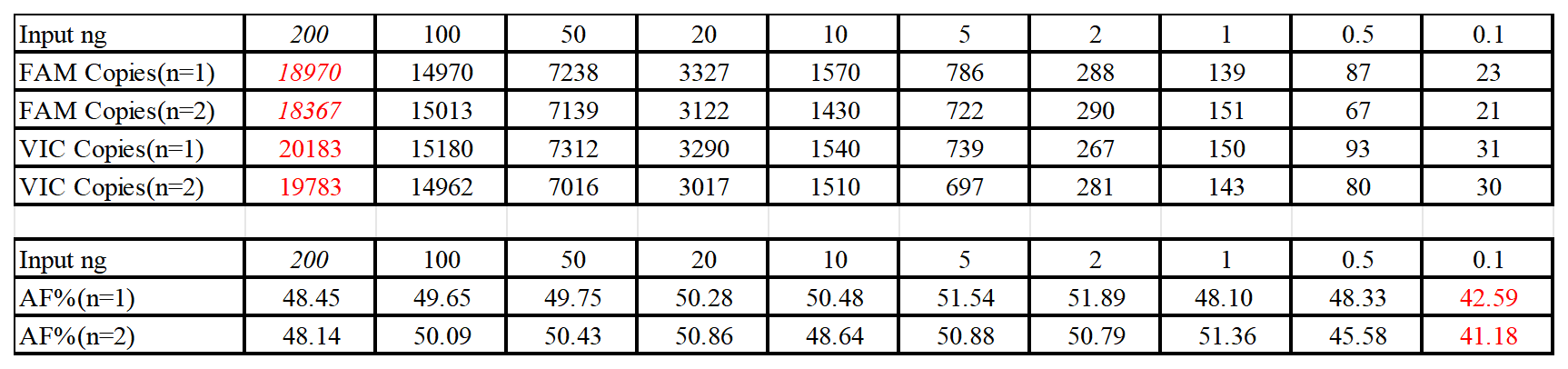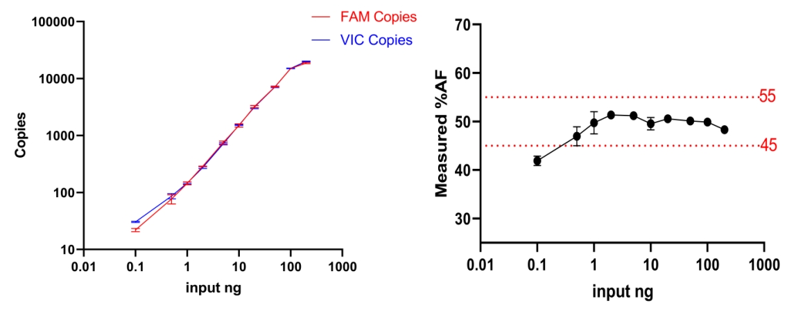 1.2 投入量在0.1ng~200ng間設置10個(gè)梯度,進(jìn)行數字PCR檢測(2復孔),判斷是否滿(mǎn)足%AF=50±10%波動(dòng)。