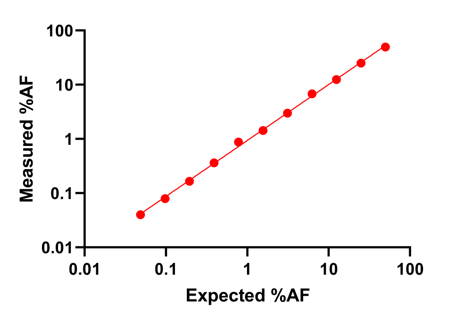 根據以上結論,我們選取10ng作為進(jìn)一步的%AF線(xiàn)性范圍探索,首先使用EGFR T790M的對應的陰性標準品,對50%的標準品進(jìn)行有限稀釋?zhuān)?.1%-50%間設置9個(gè)AF梯度,進(jìn)行數字PCR檢測(2復孔)。