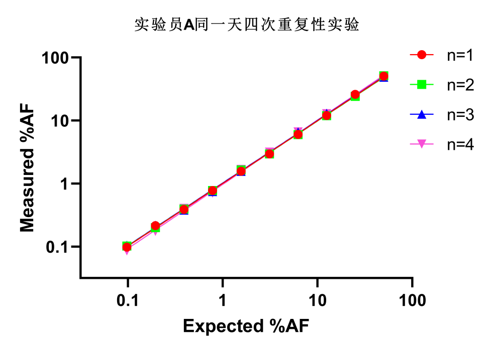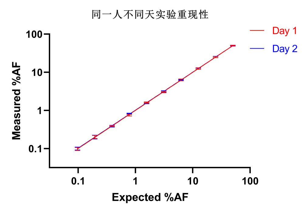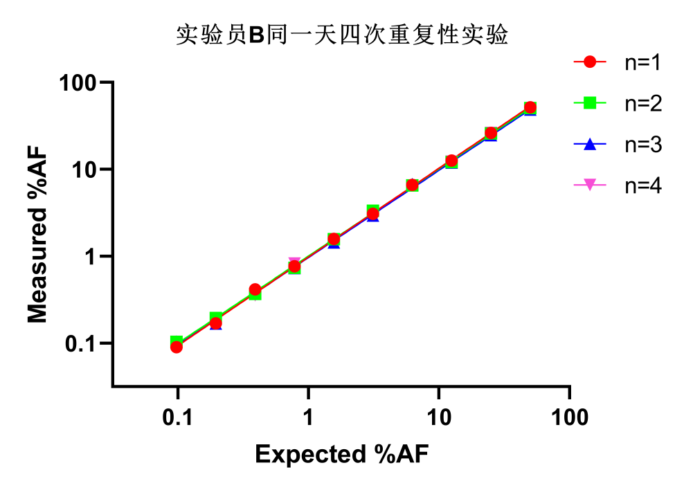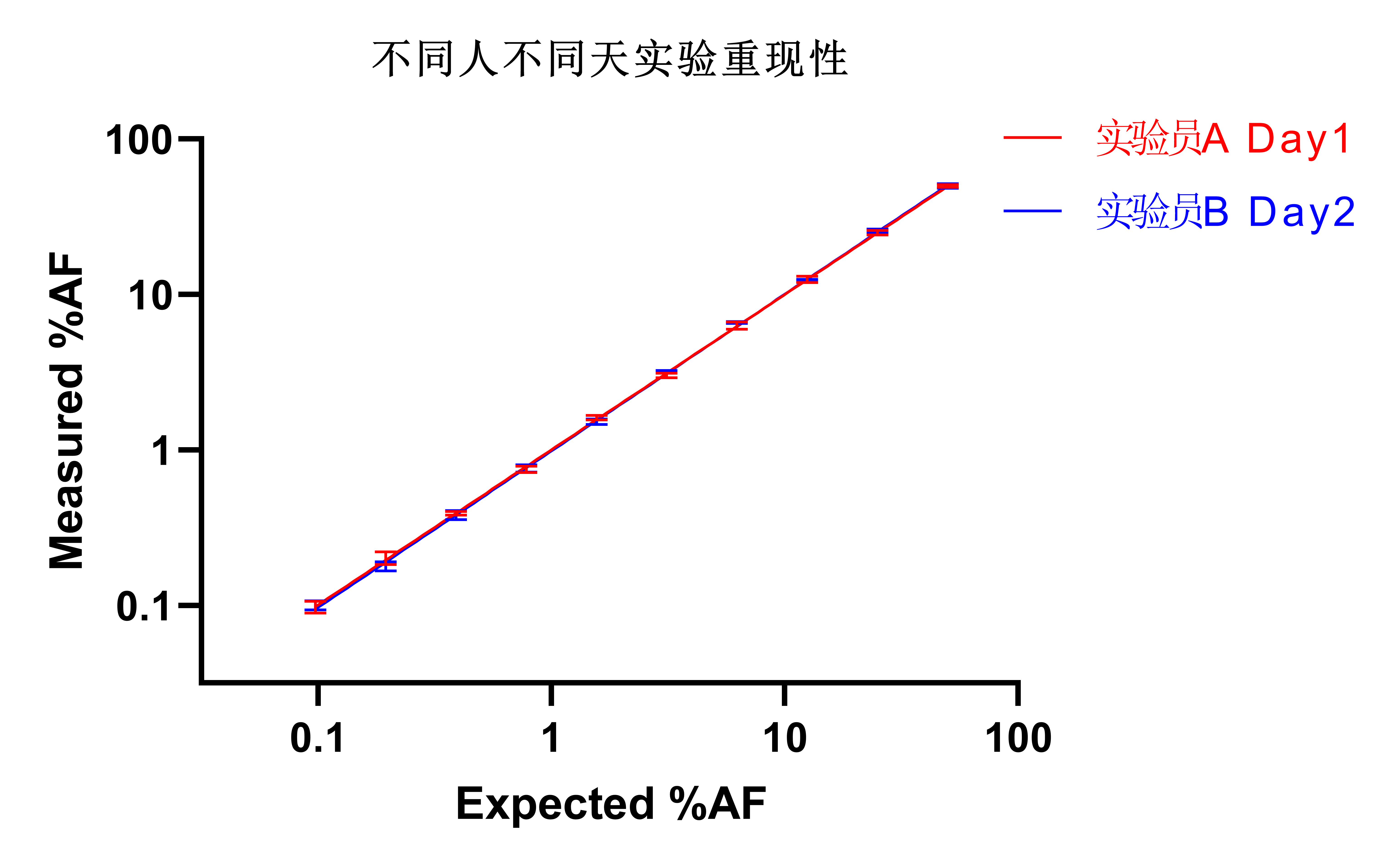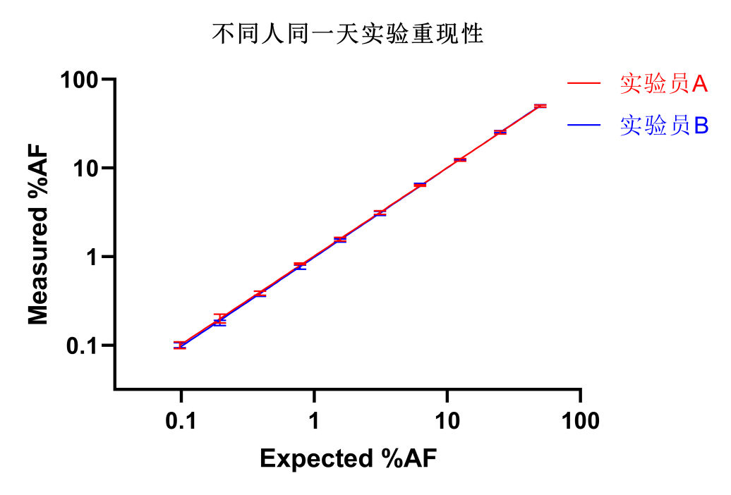 取10個(gè)不同AF(1%~50%)的標準品樣本,分別安排①實(shí)驗員A、實(shí)驗員B在同一天進(jìn)行每人四次實(shí)驗測試;②實(shí)驗員A在第一天、第二天分別進(jìn)行四次實(shí)驗測試;③實(shí)驗員A在第一天進(jìn)行四次實(shí)驗測試,實(shí)驗員B在第二天進(jìn)行四次實(shí)驗測試。