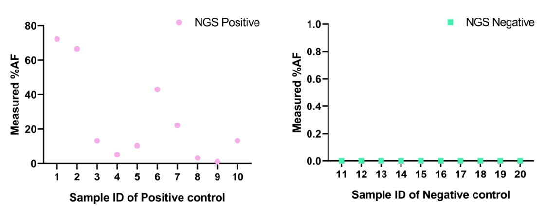 ①測試10個(gè)NGS陽(yáng)性樣本,檢測結果均為陽(yáng)性,陽(yáng)性符合率100%,并定量檢出變異頻率。