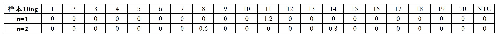 待測樣本:10個(gè)NGS驗證為陽(yáng)性的樣本(編號1-10); 10個(gè)NGS驗證為陰性的樣本(編號11-20)。對20個(gè)樣本分別使用數字PCR檢測。