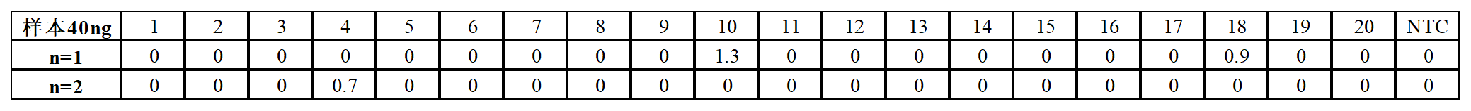 待測樣本:20個(gè)陰性樣本和1個(gè)NTC。分別將投入量設置為10ng和40ng,每個(gè)樣本做兩個(gè)重復進(jìn)行Bio-Rad數字PCR檢測。